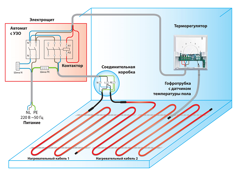 Схема подключения нагреваемой электрической системы через терморегулятор